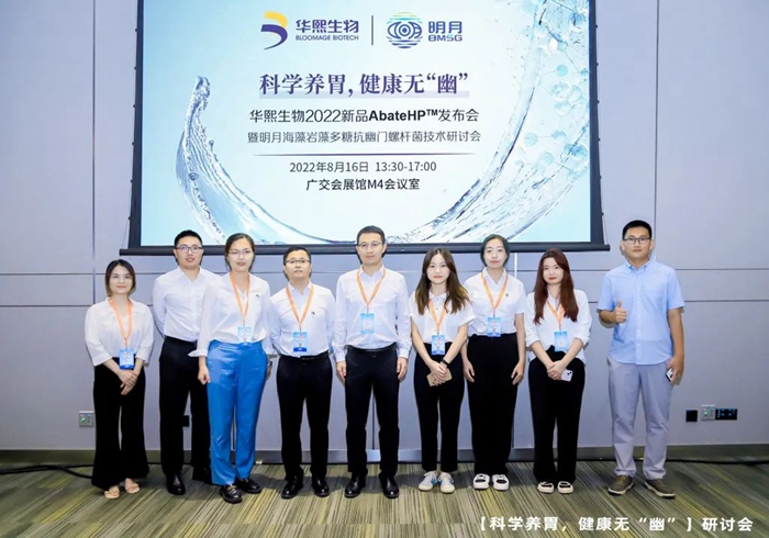 8月16日下午,明月海藻集團在FIC2022展會M4報告廳舉辦明月海藻巖藻多糖抗幽門螺桿菌技術研討會,圍繞“科學養胃 健康無‘幽’”的主題,展示BMSFu?巖藻多糖在清幽賽道上的技術革新及應用創新,分享胃腸健康未來趨勢,致力于打造差異化的胃腸道健康解決方案。